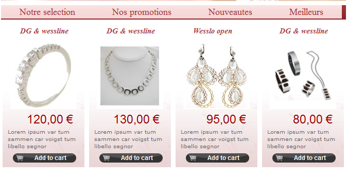 AVENTICA Posted July 12, 2012 Share Posted July 12, 2012 (edited) Bonjour Un nouveau module pour vous à un prix de 30 € MODULE PRODUCTBYTAB ce module se présente sous forme d’onglets en page d'accueil présentant, les nouveaux produits, les promotions, les meilleures ventes et une sélection de produits à votre guise. Bénéfices pour le marchand Entièrement paramétrable, le marchand peut diffuser ses produits dans un même emplacement par un simple système d’onglet. Depuis le panneau d’administration, il est possible d’activer l’affichage d’un ou de plusieurs onglets. Bénéfices pour votre client Ce module offre la possibilité de consulter une large gamme de produit dans un espace restreint via une simple navigation par onglets. Fonctionnalités - Activation /désactivation des onglets via le panneau d’administration. - Affichage de produits au centre de la page d’accueil - Affichage de produids phare, promotions, meilleurs ventes Compatibilité - version Prestashop 1.4.x Cliquez ici pour acheter le module Support: FR et EN documentation offerte. Contact: [email protected] Edited July 31, 2012 by CSN (see edit history) Link to comment Share on other sites More sharing options...