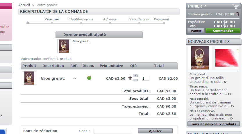 Picarene Posted July 12, 2017 Share Posted July 12, 2017 Bonjour Prestashop 1.7.1.2 par défaut. Je n'ai pas encore touché à un seul fichier. J'essaie de mettre les taxes du Québec (mais je n'ai pas encore validé). Je suis rendue à l'étape d'un pop-up qui fait un bilan de ma commande. Prestashop soustraie la taxe canadienne de 5% au lieu de l'ajouter Vous pouvez essayer, le site est en développement et les commandes ne sont pas officielles http://reneepicard.ca/douxmouton3 J'essaie d'ajouter une image mais la fonction ajout d'image du site ne fonctionne pas. Merci Link to comment Share on other sites More sharing options...
