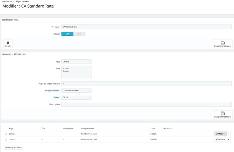 France Posted November 3, 2012 Share Posted November 3, 2012 (edited) Bonjour J'essaie de configurer les taxes cependant j'ai un petit problème. Faut dire que j'ai commencé à jouer dans la nouvelle version il y a plus de 2 semaines et que ce n'est qu'aujourd'hui que je reprend la mise en place des taxes et je ne sais plus ce que j'ai fait et pas fait car je n'avais pas trouvé ce topic avant. Selon l'image de Sabrina Maréchal "Pays/ Etat / Comté" on configure les taxes pour les différentes provinces. Je n'ai pas le Québec. Donc comment ajouter le Québec ? Je viens de faire la configuration pour les autres provinces mais quand j'y retourne ce que j'ai fait n'est pas enregistré. Pourquoi la configuration que je j'ai n'apparait pas lorsque je click sur Canada dans Règles des taxes ? Merci de votre aide N.B. J'ai réussi à retrouver mon Québec pour le mettre avec le Canada cependant dû à différents tests pour que les taxes fonctionnent je n'ai présentement plus de taxes qui se calculent. Les taxes par défaut qui devraient être celles du Canada ne se calculent pas. Dans la fiche produit Règle des taxes je n'ai plus rien. :-( Edited November 3, 2012 by France (see edit history) Link to comment Share on other sites More sharing options...