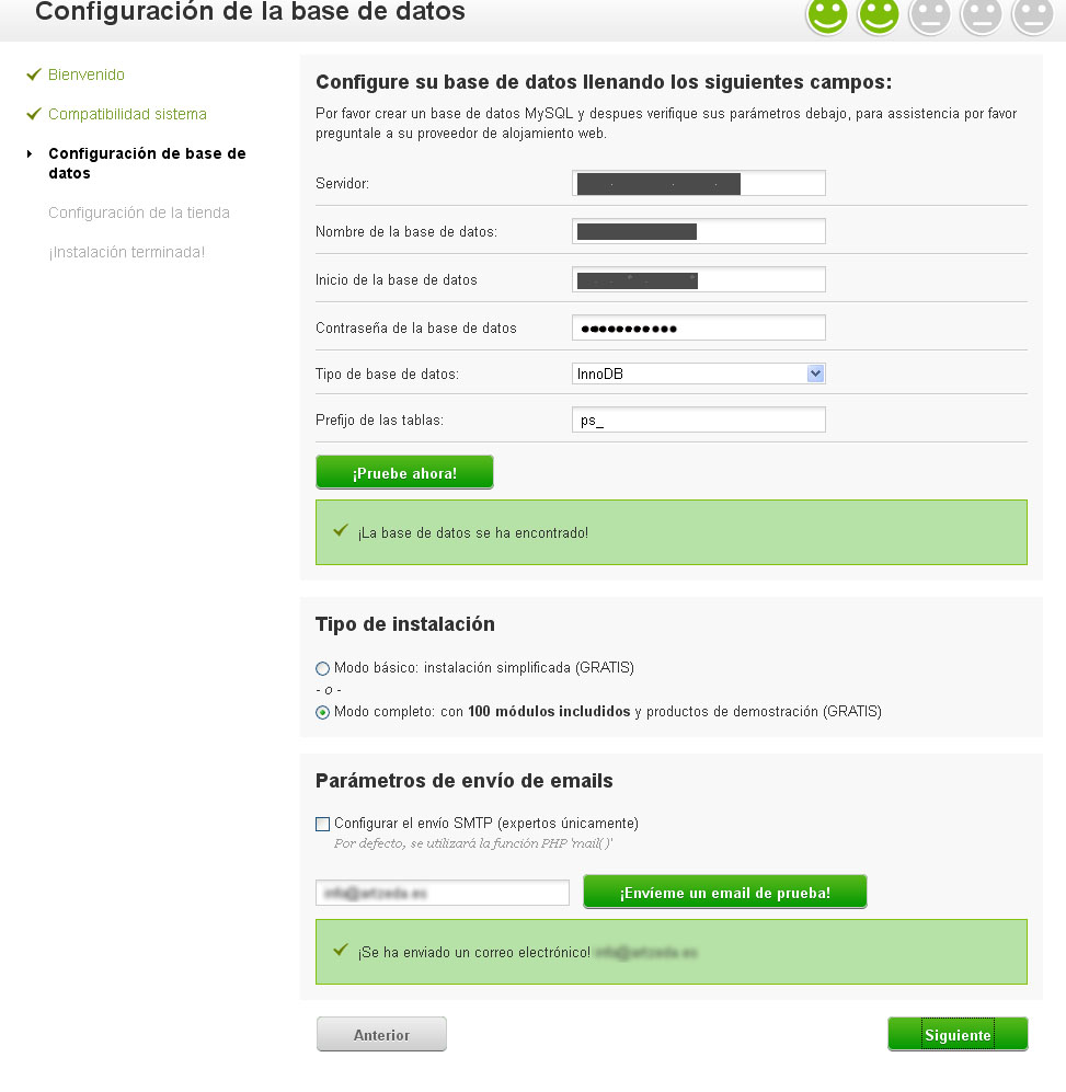 hola a todxs. estoy intentando instalar prestashop 1.4.8.2 en un servidor remoto y una vez configurada la base de datos, correo, y darle a 'siguiente' crea las tablas en la base de datos pero no pasa a la página 'configuración de la tienda' y permanece en el paso 3 de la instalación. Si vuelvo a darle a 'siguiente' me dice que ya existe la base de datos, que he de borrarla y crear una nueva. Lo he intentado dos veces borrando y creando la db otra vez. El icono de progreso de instalación (arriba a la derecha) permanece gris, pero la configuracion de db, correo y la creación de tablas se ha realizado con éxito. ¿alguien me puede ayudar? ¿cómo puedo terminar la instalación?