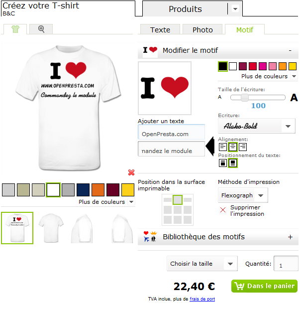 Guest OpenPresta Posted July 22, 2012 Share Posted July 22, 2012 (edited) Bonjour, J'ai terminé le développement d'un concepteur de module (Maker Ring) http://www.wisselringen.nl/nl/designer Votre avis sur le travail ? Je vais bientôt terminer un module de html5 concepteur t-shirt (pas de flash) voir si vous êtes intéressé par ce module ou des modules de hautes gammes merci de me contacter Mon email: [email protected] ou skype: abkour.web Edited July 22, 2012 by OpenPresta (see edit history) Link to comment Share on other sites More sharing options...