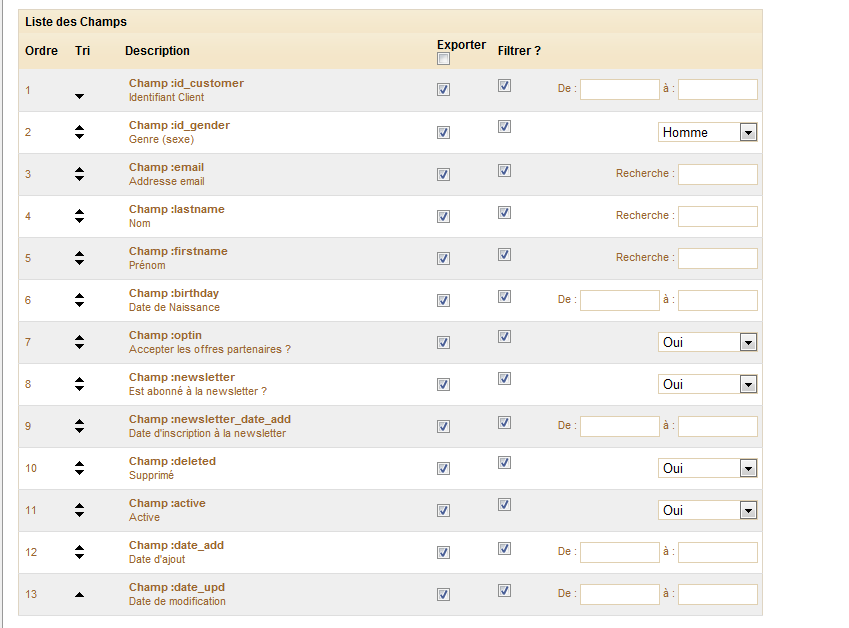 AVENTICA Posted July 26, 2012 Share Posted July 26, 2012 (edited) Bonjour, Un nouveau module pour vous en vente sur notre boutique et sur le prestastore Description L'export de vos utilisateurs est une étape importante pour vous permettre d'organiser des opérations de mailing spécifiques, ou pour exporter ces informations sur vos outils de gestion de clientèles (CRM / ERP / etc...). Le module « Export Customer », vous permet de générer de manière simple et intuitive les exports de l'ensemble de vos utilisateurs de manière filtrable et triable Ce module vous permet d'exporter très simplement par exemple : Tous les utilisateurs inscrit à la newsletter L'intégralité de vos clients de sexe féminin L'intégralité des clients masculin de 20 à 35 ans Une adresse spécifique Date de naissance Date de création Date dernière modification Etc... Compatibilité : prestashop 1.3, 1.4 + Le module export client est disponible sur le prestastore ici au prix unique de 40 € et sur notre boutique shop aventica au prix promotionnel de 35 € cliquer ici pour le télécharger. Contact support: [email protected] skype: csomon Edited July 31, 2012 by CSN (see edit history) 1 Link to comment Share on other sites More sharing options...