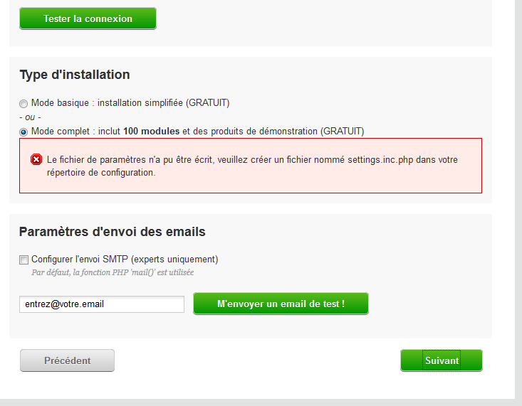 BirdFree Posted July 31, 2012 Share Posted July 31, 2012 Bonjour à tous ! Je part actuellement sur une nouvelle install de la dernière version 1.4 et je rencontre un problème bloquant. Voici le message d'erreur : Le fichier de paramètres n'a pu être écrit, veuillez créer un fichier nommé settings.inc.php dans votre répertoire de configuration. Après quelques recherche j'ai juste trouver ceçi : http://www.prestashop.com/forums/topic/25480-maj-1105-121-fichier-settingsincphp-vide/ Mais comme vous pouvez le constater, il n'y a aucune réponse au sujet. Quelqu'un aurrait-il une solution à ce problème ? Merçi d'avance pour votre aide ! Link to comment Share on other sites More sharing options...