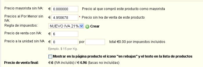 nadie Posted July 31, 2012 Share Posted July 31, 2012 Hola, tengo un problema con el cálculo del iva, ya he creado el impuesto al 21% pero el resultado del algoritmo me da como si en realidad fuera del 17.3%, no se si he tocado algo en descuentos automático o que pero no se como solucionarlo. También borré las tablas correspondientes y nada les pido por favor si me pueden hechar una manito con el tema adjunto una imagen. Gracias Ese calculo que muestras en la imagen es correcto. (Te esta sumando el 21% de forma correcta) Link to comment Share on other sites More sharing options...