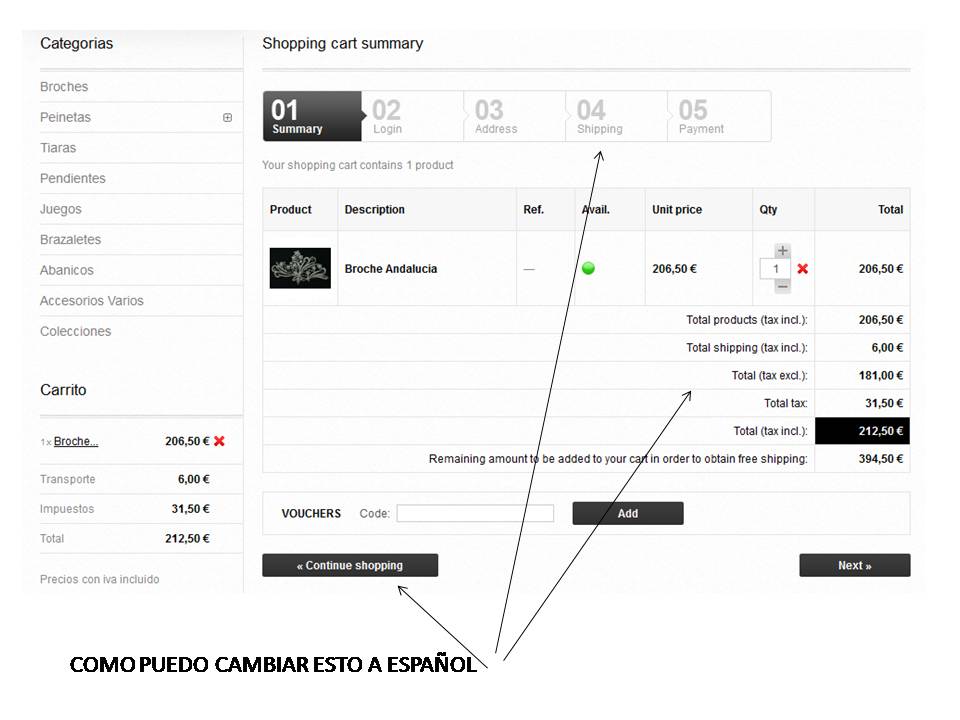 nadie Posted August 8, 2012 Share Posted August 8, 2012 Solicito un SOS desesperado, tengo todo lo concerniente al proceso de compra en ingles y el resto de la pagina en español. Hice la consulta estos dias atras pero no he podido solucionar el problema. He seguido vuestro consejo del php.ini , para localizarlo cree el comando que dice la ubicacion (phpinfo.php) pero no consigo encontrar la ruta os dejo el resultado (/usr/lib/php5/php.ini), donde puedo localizar eso exactamente. Aun asi os dejo una imagen que creo que vale mas que mil palabras. Como veis estoy un poco desesperado porque llevo dos o tres dias parado con este problema del idioma e incluso tuve que traducir algo manual pero el resto no lo encuentro. Gracias a todos ¿Ahora mismo puedes traducir, desde la pestaña Herramientas -> Traducciones? Link to comment Share on other sites More sharing options...