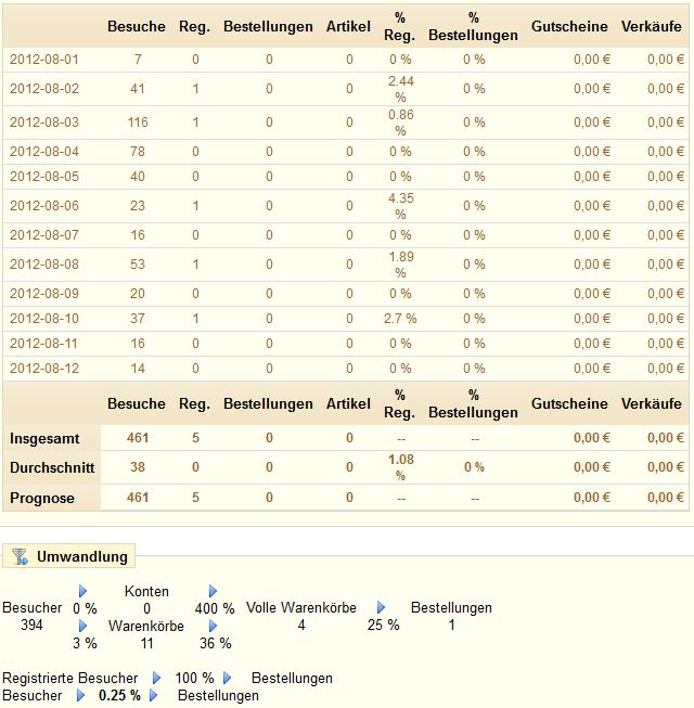 guest* Posted August 16, 2012 Share Posted August 16, 2012 Bei Besuche ist auch immer darauf Bedacht zu nehmen, dass IP's wechseln. Warenkörbe können angelegt worden sein, aber nicht abgeschlossen. Daher auch die Diskrepanz Warenkorb zu Bestellung. Eine Bestellung wird dennoch immer auch am Tag geschrieben wo diese stattgefunden hat. Die Serverkonfiguration stimmt auch ? Ich habe schon einmal erlebt, dass einer meiner Provider ein ganz falsches Datum am Server hatte. Nicht nur die Uhrzeit, sondern auch den Tag !! Eine Bestellung gilt als eingegangen, wenn diese den Status bezahlt erlangt hat. Vorher können ja noch Stornos oder Anpassungen gemacht werden. Aus diesem Grund wird die Bestellung in der Stat erst bei Geldeingang aktiv mitgezählt. Link to comment Share on other sites More sharing options...