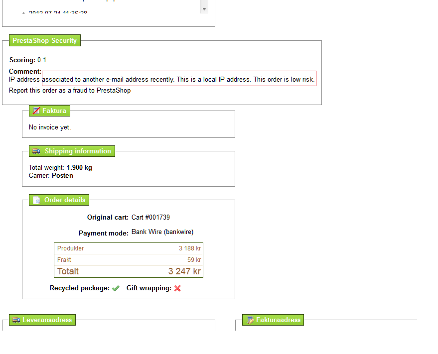 Eddan Posted August 17, 2012 Share Posted August 17, 2012 (edited) Hej på er därute Installerade prestafraudmodulen och verkar fungera bra förutom en sak, återrapporteringen man får från modulen gällande en beställning är för bred för "utseendet" i BO, när modulen är inaktiverad så hamnar alla rutor där de ska vara när man tittar på en beställning, men så fort man aktiverar så är rutorna ute o far... se exempel på bilden... det jag är ute efter är tt på rad 496 i prestafraud.php så finns följande kod <p><b>'.$this->l('Comment:').'</b> <br> '.htmlentities($scoring['comment']).'</p> Jag vill att ($scoring['comment']) ska bryta efter x antal tecken, på så sätt blir inte fönstret för brett och allt ser sjysst ut i BO... Någon som kan komma med förslag på en lösning så är ni/du bäst....försökt med wordwrap, men får inte till det //Eddan Edited August 17, 2012 by Eddan (see edit history) Link to comment Share on other sites More sharing options...