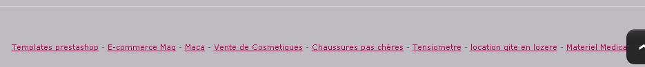 Je suis sous Prestashop 1.4.8.2 avec le thème dm-free01-red que j'ai biensur retravaillé. J'ai un problème par rapport aux publicités qui se trouvent en footer car je n'arrive pas à trouver le fichier afin de les enlever. Ces liens sont des pubs pour de la vente de cosmétiques, de chaussures pas chères, de tensiomètre... Bref ! Il y en a pour tous les gouts.