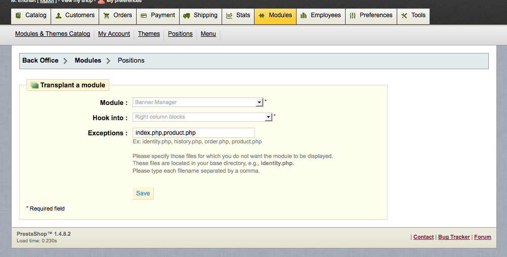 is there any way to change the function "Exceptions" in BO - > Modules - > Positions -> Transplant a Module?