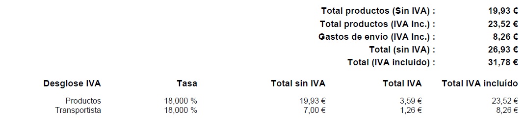 arkitroch Posted August 21, 2012 Share Posted August 21, 2012 Buenas, estoy perfilando ya el tema de contabilidad de la web, y me estoy dando cuenta que las facturas vienen incompletas (al menos a mi entender). Yo necesito que la factura me muestre: - Base imponible productos (productos sin iva) - Base imponible envio (envío sin iva) - Total base imponibles (suma productos sin iva + envio sin iva) - Cuota del impuesto (total de iva) - TOTAL (total con iva) A mi ya me sale los productos sin iva y el total con iva, pero los demás valores no. He estado leyendo por el foro y a los demás usuarios les aparece sin problemas el envío sin iva. Yo lo tengo configurado como un transportista con id regla de impuestos al 18%, y no me sale ese dato, solamente me indica el precio del envio con iva incluido. Los demás datos, la suma sin iva de los productos y el envío no me aparece, y la cuota de iva tampoco. Se que tengo que modificar el archivo pdf.php , pero no se por donde empezar. Ayuda por favor!!! Adjunto una imagen donde se muestran los valores que me está calculando Prestashop ahora mismo, a ver si me podéis ayudar para que me calcule los valores que indico más arriba. Un saludo compañeros! Link to comment Share on other sites More sharing options...