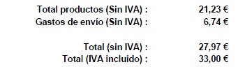 jorgeM Posted March 10, 2013 Share Posted March 10, 2013 Hola arkitroch ¿Has podido incluir en la factura la Cuota del impuesto (total de iva)? He hecho las modificaciones que propones y queda muy bien la factura, excepto que no aparece el desglose del IVA por separado. Si tienes la solución te agradeceria la pusieras en el post. El módulo de Claramaria no me sirve, mi versión es 1.48 Gracias a todos, los que no tenemos demasiada idea encontramos nuestras respuestas gracias a vuestra ayuda. Saludos Link to comment Share on other sites More sharing options...