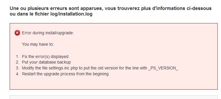 jdo-cecile Posted August 22, 2012 Share Posted August 22, 2012 Bonjour, Je voulais faire ma mise à jour comme indiqué ci-dessous http://doc.prestashop.com/pages/viewpage.action?pageId=3801170#Mettre%C3%A0jourPrestaShop-Encasdemise%C3%A0jour%C3%A0partird%27uneversionentrela1.3etla1.4.3 Le 1er soucis que j'ai : la vérification pour les magic quotes est coché rouge. Est-ce important ? et quand j'ai voulu aller plus loin, car je n'ai rien trouvé de significatif sur le forum.. J'ai un beau message d'erreur (en pièce jointe ci-dessous) et lorsque je vais voir mon fichier installation.log, il y a pleins d'erreurs avec ma base de données. Si quelqu'un a une idée pour m'aider ce serait super. Merci d'avance ps : j'avais fait ma mise a jour en local, je n'avais pas eu de soucis particulier. Link to comment Share on other sites More sharing options...
