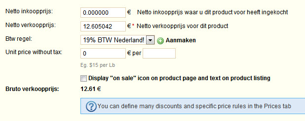 GvW Posted August 22, 2012 Share Posted August 22, 2012 (edited) In PS 1.4.8.2 is de Bruto verkoopprijs niet zichtbaar in het beheer bij een product. Btw tarief wel en de netto verkoopprijs ook. In de shop zie je wel keurig de incl. prijs dus dat gaat goed. Via verschillende postings in dit forum zie ik wel dat je het eens moet proberen in een andere browser, de cache leeggooien, smarty cache x2x via ftp leeggooien en het btw tarief een keer moet verwijderen en opnieuw aanmaken, ook koppelen aan de zones (landen) e.d.... niets helpt! Heeft iemand van jullie een oplossing? Edited August 25, 2012 by GvW (see edit history) Link to comment Share on other sites More sharing options...