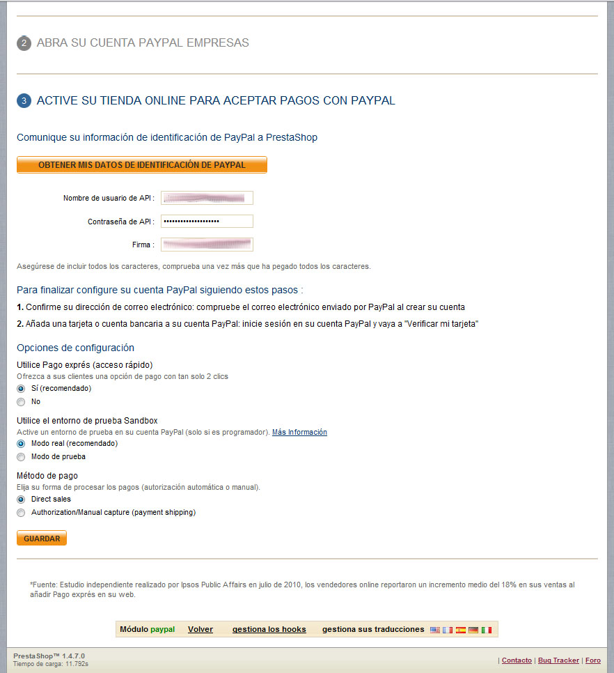 nadie Posted August 25, 2012 Share Posted August 25, 2012 Buenos dias: Os pongo un pantallazo de como tengo configuradas las opciones del módulo, creo que no está en modo de pruebas y los campos de la api, los he copiado y pegado unas cien veces. Lo único que me ha pasado en una de las muchas veces que he instalado y desinstalado el módulo, es que me ha dado este error: Compruebe los registros: 1. PayPal response: 2. TIMESTAMP -> 2012-08-25T08:04:43Z 3. L_ERRORCODE0 -> 10002 4. L_SHORTMESSAGE0 -> Security error 5. L_LONGMESSAGE0 -> Security header is not valid 6. L_SEVERITYCODE0 -> Error No se si tendrá algo que ver esto con lo otro, pero lo pongo por si os dice algo. Un saldo, Hola, ese error es un clásico, lo suele dar, cuando en la pestaña módulos, en la configuración del modulo, has señalado que trabajas con modo pruebas. Mas info: http://www.factoriad...l-en-prestashop De todos, modos ahora dices que no da ningun error..., que simplementes haces el proceso normal, pero que no llega el dinero, ¿o me he confundido? Link to comment Share on other sites More sharing options...