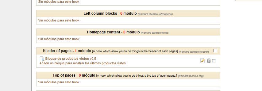 nuevoenesto Posted August 25, 2012 Author Share Posted August 25, 2012 Yo soy tambien novato con prestashop, hace pocos días que estoy metido en el tema y también me salió tu duda... es más sencillo de lo que crees. En la pantalla que muestras en tu imagen adjunta fíjate que arriba de todo a la izquierda hay un botón verde que pone "mover módulo", pulsa ahí y verás que se abre una ventana con desplegables... el primero es para escoger el módulo que quieres mover (copiar) y el segundo es para decir en qué hook (ubicación) lo quieres... Realmente el módulo no lo mueves, lo copias a la nueva ubicación y si quieres lo borras de la ubicación original a posteriori, aunque como te han dicho mejor no tocar el header... Saludos! GRacias amigo! Con estas sencillas explicaciones he logrado ver algo que es sencillo, pero en lo que no habia caido. Salucionado! Link to comment Share on other sites More sharing options...