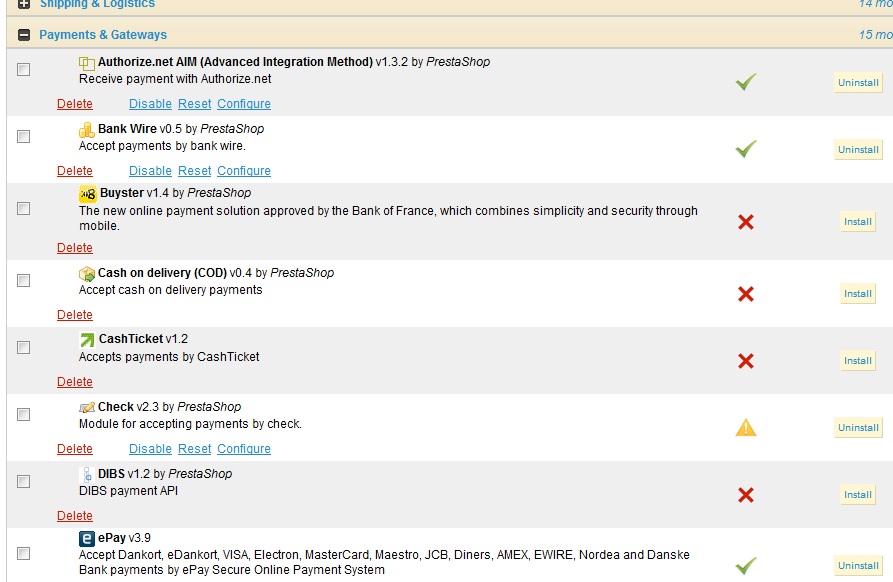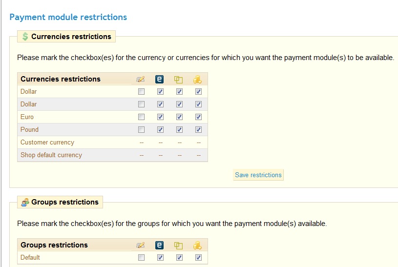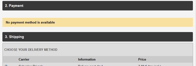 degger Posted August 25, 2012 Share Posted August 25, 2012 Selamat malam, saya butuh bantuan dari teman semua masalah "No payment method is available"... padahal modul payment sudah saya install baik bankwire, paypal tapi tidak ada yang muncul.... terus Back office – Payment tab juga udah saya lihat... "Back Office > Payment > Countries restrictions " terimakasih untuk bantuannya, Link to comment Share on other sites More sharing options...