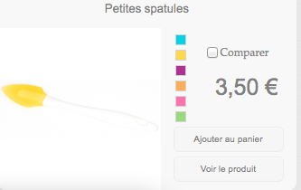 Arômes & Gourmandiz Posted August 28, 2012 Share Posted August 28, 2012 Bonjour, Site Projets a gentiment proposé une solution pour l'affichage des puces de couleurs disponibles sur les pages catégories (ICI) Alors chez moi ça marche nikel sauf un soucis de style, visiblement lié à mon thème (DecoEvo) car j'ai plusieurs produits qui s'affichent par ligne. Voici mon soucis : les cases couleurs dans les pages catégories s'incrémentent dans le bouton 'ajouter au panier' ce qui à 2 conséquences : Lorsque l'on clique sur les couleurs (peu importe lesquelles) --> On clique sur le bouton 'Ajouter au panier' --> Le produit va directement dans le panier sans le choix du paramètre couleur ni le passage par la fiche produit. Le texte 'Ajouter au panier' qui est à la base dans le bouton est décalé juste avant le bouton 'ajouter au produit' donc ce n'est plus cohérent. Une idée d'où ça pourrait venir? Link to comment Share on other sites More sharing options...