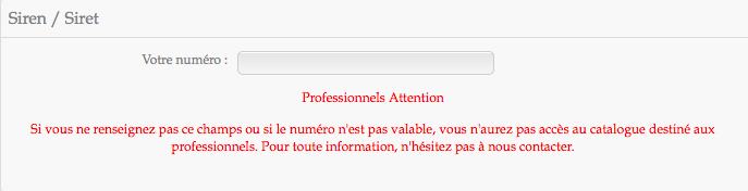 Arômes & Gourmandiz Posted August 29, 2012 Share Posted August 29, 2012 (edited) Bonjour, Si vous avez le module Siret-Siren (n'y voyez aucune pub) et que vous souhaitez afficher un texte dans le formulaire de création de compte au niveau du bloc du module, voici comment faire : Dans le fichier siren_siret_form.tpl, ajoutez le texte suivant (en adaptant bien sûr le code HTML au rendu souhaité) : <br><p align="center"><font color="red">Professionnels Attention </p> <p align="center"><font color="red">Votre texte d'avertissement</br></p></font> Juste sous la ligne: value="{if isset($smarty.post.numero_siren_siret)}{$smarty.post.numero_siren_siret}{/if}" /> Et le rendu en PJ avec un texte que j'ai adapté. En espérant que cela serve un jour à quelqu'un. Bonne journée. Edited August 29, 2012 by Arômes & Gourmandiz (see edit history) Link to comment Share on other sites More sharing options...