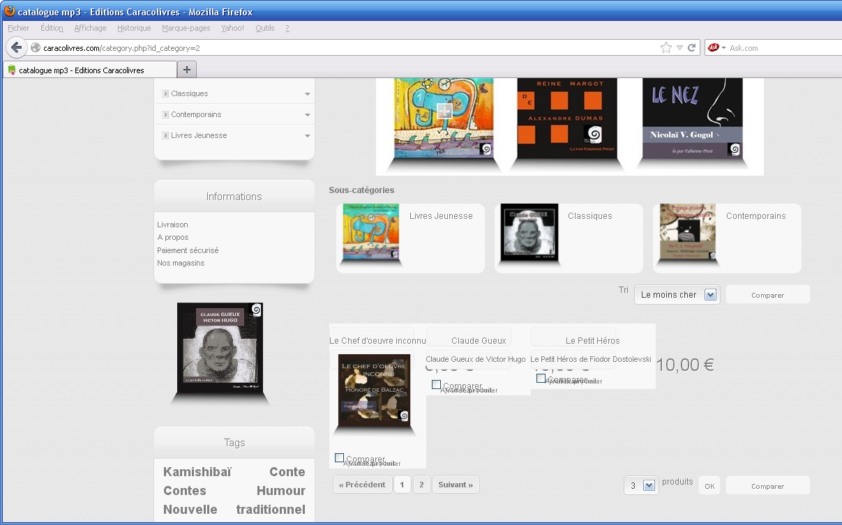 fabp Posted August 30, 2012 Share Posted August 30, 2012 Bonjour ! Je rencontre un problème pour mes images sur prestashop. Soit elles apparaissent en largeur pour les catégories, soit en hauteur. ex ci-dessous : http://caracolivres.com/category.php?id_category=27'>http://caracolivres.com/category.php?id_category=27 et je ne sais pas comment modifier cela. autre problème d'affichage : Je souhaiterais que le prix ne s'affiche pas sur la page d'accueil, et je ne sais pas comment faire: http://caracolivres.com/category.php?id_category=2 Même chose avec le module ou les lignes : tri/comparer que je n'arrive pas à faire disparaître de la page d'accueil. si vous avez une idée pour résoudre ces pbs, merci d'avance ! Link to comment Share on other sites More sharing options...