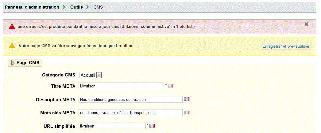 narcy Posted August 31, 2012 Share Posted August 31, 2012 bonjour J'ai un problème lorsque je veux enregistrer une page CMS , voila les messages reçu: une erreur s'est produite pendant la mise à jour cms (Unknown column 'active' in 'field list') Votre page CMS va être sauvegardée en tant que brouillon donc je ne peux pas publier ma page Je vous joint une capture écran. Je cherche est je ne trouve pas la solutions, une aide serais la bien venu. je remercie d'avance Link to comment Share on other sites More sharing options...