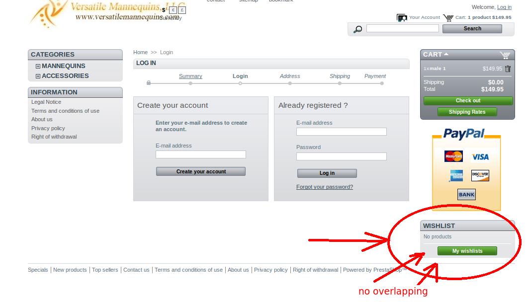 lweinlan Posted September 5, 2012 Author Share Posted September 5, 2012 hi , link to shop is www.versatilemannequins.com Please give me your IP address, I will add it to the allowed IP addresses in the back office. My shop is under construction. I think that the issue is that the middle page is not "elastic". The footer should be "pushed" down when the blocks stacked in the right column exceed the size between the header and the footer blocks... I do not have this issue with the default theme for prestashop, only with the "pzone" theme. With the default theme, I have no overlapping of the footer (see attached screenshot) Please help.. thank you Link to comment Share on other sites More sharing options...