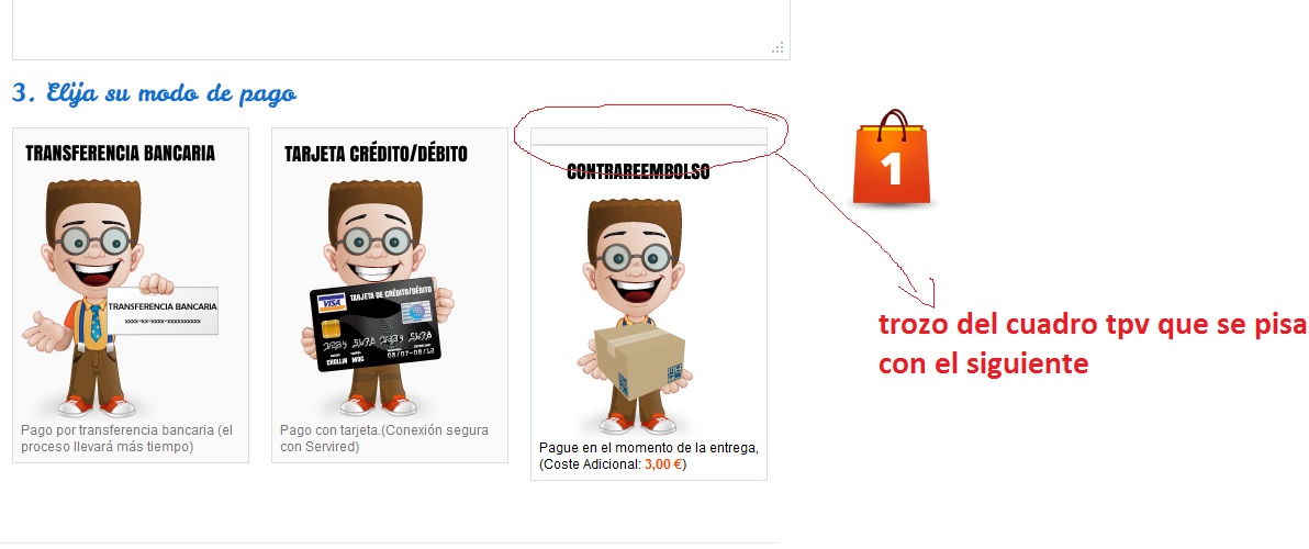 JValenzuela Posted September 4, 2012 Share Posted September 4, 2012 (edited) Hola realmente no sabía como llamar al post. El problema me ha surgido al personalizar los botones de pago en la pagina de pedido-rapido y es que el botón de TPV (servired) pisa al siguiente en su cuadro. Parece que el problema viene del .tpl y hace tiempo leí por aquí en el foro la solución pero ahora mismo no la encuentro entre tantos mensajes. Adjunto captura Esto es lo que me encuentro en el tpl, el problema parece la línea 2 pero ni idea de que puede ser... <p class="payment_module"> <a href="javascript:$('#servired_form').submit();" title="{l s='Conectar con el TPV' mod='servired'}"/> <img src="{$module_dir}tarjetas.png" alt="{l s='Conectar con el TPV' mod='servired'}"/> {l s='Pago con tarjeta.(Conexión segura con Servired)' mod='servired'} {if $fee>0} <br/><br/> {l s='Este método de pago lleva asociado un recargo de ' mod='servired'}{convertPrice price=$fee}.{l s='El recargo se sumará a los gastos de envío' mod='servired'} </a> {/if} Edited September 4, 2012 by heiser (see edit history) Link to comment Share on other sites More sharing options...