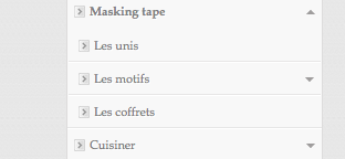 Arômes & Gourmandiz Posted September 5, 2012 Share Posted September 5, 2012 (edited) Bonjour, Voici un aperçu de mon menu catégories qui est situé dans la colonne de gauche sur mon site : J'aurais aimé pouvoir un peu mieux distinguer les catégories principales (ici 'Masking tape') des sous-catégories ('Les unis' - 'Les motifs'...). Ici on voit que la catégorie principale est en gras car je suis sur la page en question mais pour le reste du menu c'est vraiment difficilement distinguable (sans parler du fait que ce soit écrit petit). Comment faire pour soit appliquer des couleurs différentes en fonction du niveau des catégories, ou alors augmenter le retrait des sous-catégories? D'avance merci! Edited September 5, 2012 by Arômes & Gourmandiz (see edit history) Link to comment Share on other sites More sharing options...