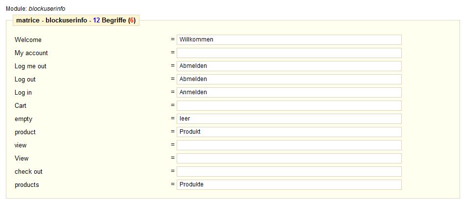 Sind die Reche auf /modules/blockuserinfo auch korrekt gesetzt ? Wenn die Datei de.php dort nicht beschreibbar ist (CHMOD 0750 0755 oder 0777) dann können die Übersetzungen nicht gespeichert werden. Auch der memory_limit von 128M am Server sollte diesen Limit nicht unterschreiten.
