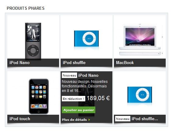 C'est un module de produits phares avec un joli effet de slide au passage de la souris pour les détails du produit.