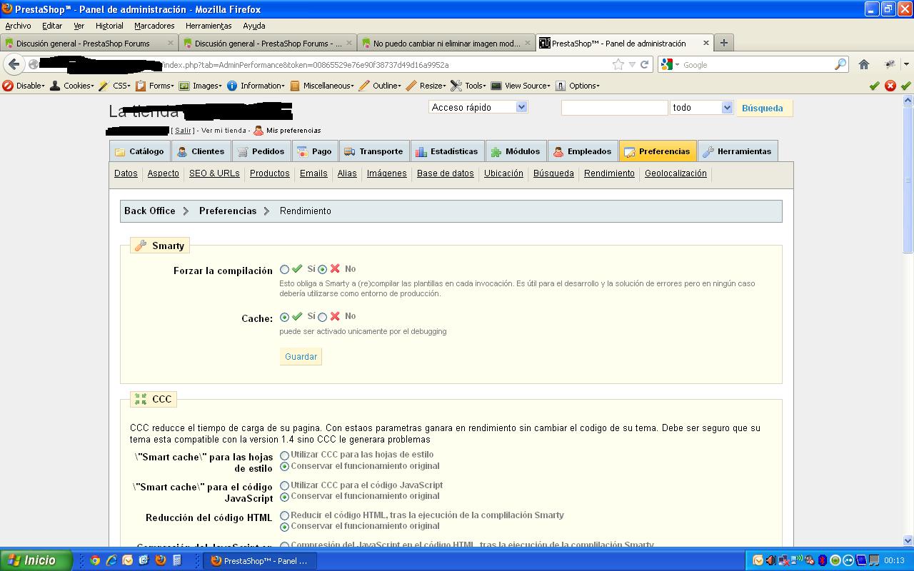 E-kipper Posted September 11, 2012 Share Posted September 11, 2012 Borra la caché de tu explorador de internet, a ver si... También puedes forzar la compliación y desactivar la cache un momento, no sea que por más que hagas cambios te siga mostrando la página que está cacheada. Para eso tienes que poner "Forzar la compilación" en 'Sí', y "Caché" en 'No' (Si es que tenías la caché en 'Sí'). Después mira a ver si la página de inicio ha cambiado. Notarás que es más lenta, eso es porque no muestra la caché y además compila la plantilla. Si ves la nueva imagen, tienes que volver a dejar la compilación en 'No' y la caché en 'Sí', para que no sea lenta tu tienda. Link to comment Share on other sites More sharing options...