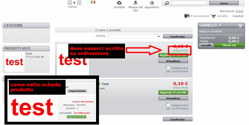 eugenata Posted September 15, 2012 Share Posted September 15, 2012 (edited) ... No, purtroppo non posso modificare la traduzione perchè sul sito avrò sia prodotti subito disponibili in magazzino sia prodotti su ordinazione. ... e questo non va bene perchè il cliente potrebbe mettere il prodotto nel carrello anche senza entrare dentro la scheda prodotto. Invece devi proprio agire sulle traduzioni, ma con qualche accorgimento in più. Se vuoi che il tuo clinte distingua i prodotti direttamente acquistabili online da quelli che possono solo essere prenotati e, questi ultimi non devono poter essere messi nel carrello, allora puoi fare in questo modo: Entri nella scheda prodotto in b.o. (quelli solo su prenotazione), togli la spunta sul flag Disponibile all'ordine. In questo modo il prodotto non potrà esserre messo nel carrello pur rimanendo visibile. Sempre nella stessa scheda prodotto, metti la spunta nel flag Mostra l'icona Saldi"... Comparirà una bizzara scritta rossa IN VENDITA, sia nella visualizzazione della pagina prodotto che della categoria. Vai a tradurre (vedi post precedente) la scritta IN VENDITA con: SOLO SU ORDINAZIONE. Ricordati per prima cosa, di ripristinare i file che hai modificato in modo da applicare queste indicazioni ad una installazione vergine. Edited September 15, 2012 by eugenata (see edit history) Link to comment Share on other sites More sharing options...