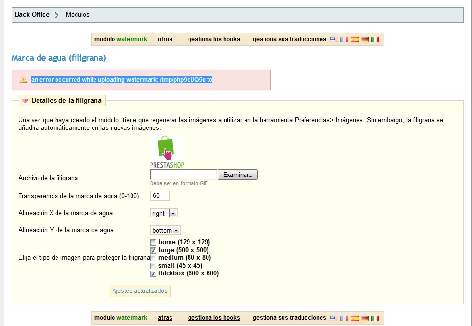 panoramis Posted September 15, 2012 Share Posted September 15, 2012 Pues eso, he intentado subir la imagen en formato .gif pero me sale el siguiente mensaje: an error occurred while uploading watermark: /tmp/php9cUQ5u to A que se debe el error o cual es la solución al problema? Versión PS 1.4.8.2 Gracias de antemano. Link to comment Share on other sites More sharing options...