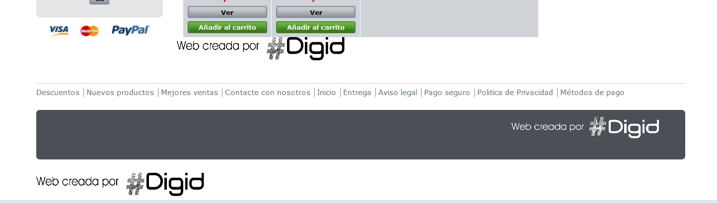 Pero cuál es mi sorpresa cuando haciendo pruebas veo que la firma de mi empresa "modelo 1" aparece en el footer (tenemos dos modelos, para fondo claro y oscuro, hasta ahí bien), y además está añadido al final de la página de productos y al final de toda la web (¿¿??), y encima es el modelo de fondos claros que no recuerdo haber metido ahí... ¿Puedo averiguar como quitarlo?