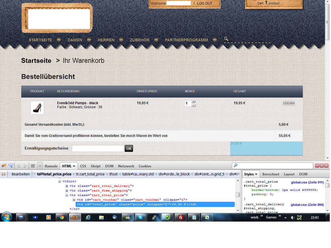 ILLEX-MEDIA Posted September 22, 2012 Author Share Posted September 22, 2012 (edited) Hallo cd2500, naja bin für jeden Tipp dankbar Also Module aus der German Community sollten eig. nicht dabei sein außer hier mit AGB und Checkboxen Kram... Der Warenkorb ist natürlich nicht mehr standard da er ja oben im Header verankert und animiert ist. Das der Warenkorb nicht funktioniert wird meiner Meinung nach durch den Fehler verursacht welcher auch den html code nicht anständig laden tut, hier vermute ich das evtl. die .css/.js Dateien nicht geladen werden die die Animation veranlassen. Es darf auch gerne selber getestet werden, aber auf den Screenshots sieht man ja deutlich das der html code sich unter scheidet. Tests unter www.schuhe-günstiger.de Ach ja, bzgl. der Frage mit dem originaltemplate.. das ist schwierig zu vergleichen, es hat ne andere shoppingcart.tpl aber so weit ich weiß wird alles richtig geladen wenn ich mich dort auf der opc Seite einlogge. Ich finde das ganze optisch so echt zufriedenstellent für diesen Zweck, aber dieser Fehler das nach dem LOgin der Korb nciht geht und die Headzeile für den Gesamtpreis fehlt finde ich echt unprofessionell MFG: Stefan Edited September 22, 2012 by ILLEX-MEDIA (see edit history) Link to comment Share on other sites More sharing options...