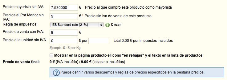 Macyuyu Posted September 17, 2012 Share Posted September 17, 2012 (edited) Buenos días, Llevo leyendo muchos días vuestros foros y me habéis dado solución a algunos problemas, pero desde que actualize a la 1.4.9 me he dado cuenta que en la ficha de producto, el precio de venta sin iva y con iva es el mismo (sin iva) aunque en el front-office el precio final figura con iva. He buscado si encontraba alguna solución pero no la he encontrado. Os dejo una captura para que veais a que me refiero. Edited September 18, 2012 by Macyuyu (see edit history) Link to comment Share on other sites More sharing options...