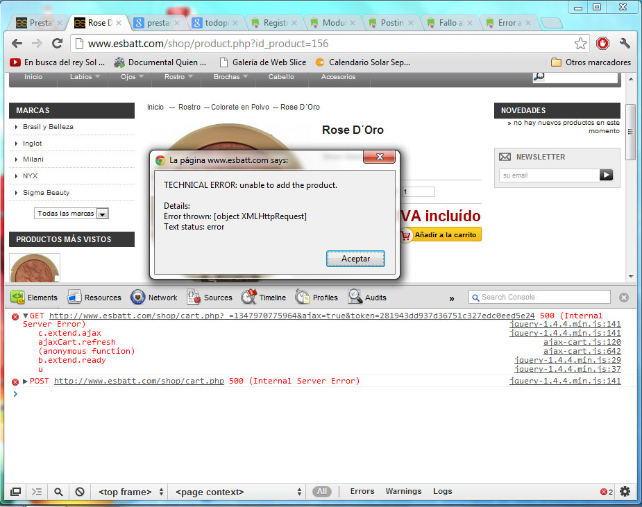 Estoy con este problema desde hace muchos días, al pulsar el botón de añadir al carrito, una ventana emergente aparece con el siguiente mensaje: