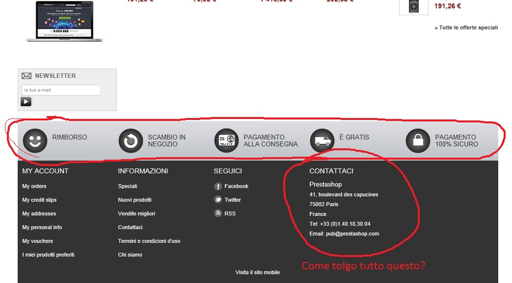 manpros86 Posted September 18, 2012 Share Posted September 18, 2012 (edited) Salve, ho scaricato 2 giorni fa prestashop e sto utilizzando il tema base per prodotti high tech. Non riesco a togliere le scritte in fondo a destra. CONTATTACI Prestashop 41, boulevard des capucines75002 ParisFrance Tel: +33 (0)1.40.18.30.04 Email: [email protected] Come posso fare? sto uscendo matto Allego la foto cosi si capisce meglio...vorrei togliere anche il rettangolo sopra con le icone Rimborso Scambio in negozio Pagamento alla consegna. È gratis Pagamento 100% sicuro grazie in anticipo Edited September 18, 2012 by manpros86 (see edit history) Link to comment Share on other sites More sharing options...