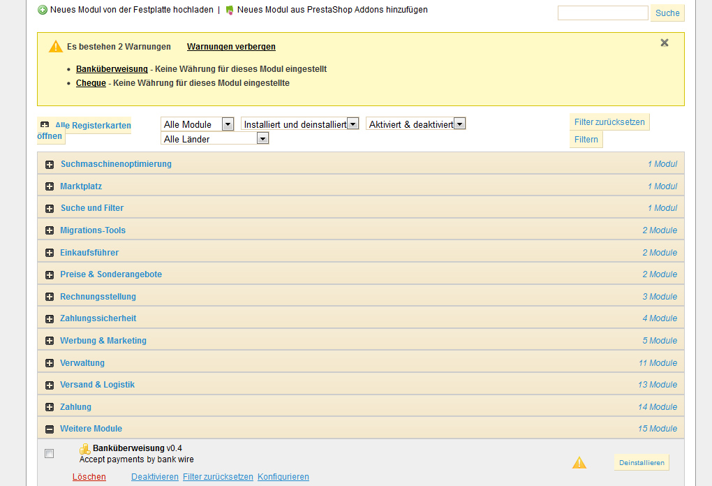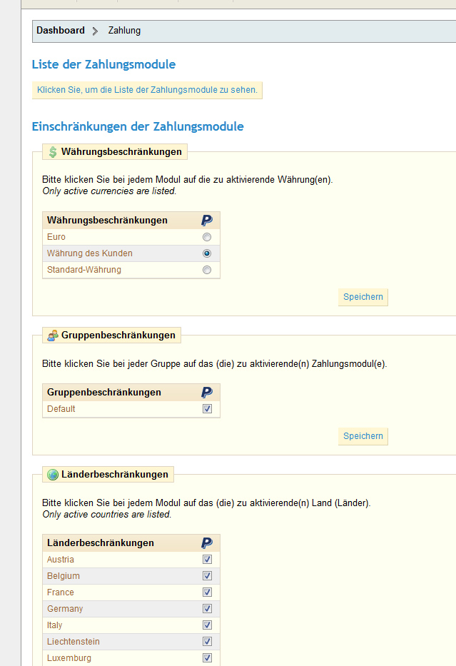 guest* Posted September 19, 2012 Share Posted September 19, 2012 Im Tabreiter zahlung hast du mehr als nur die Links. Darunter hast du: Währungsbeschränkung, Gruppenbeschränkung, Länderbeschränkung. Hier musst du deine Wahl treffen. Verstehe nicht wo das Problem liegt. Wähle dort Euro aus, wähle die Kundengruppe aus und die Länder wo das Modul beschränkt, bzw. aktiviert werden soll. (s. Screen) Kannst du dort nichts auswählen, nichts speichern, oder was ? Link to comment Share on other sites More sharing options...
