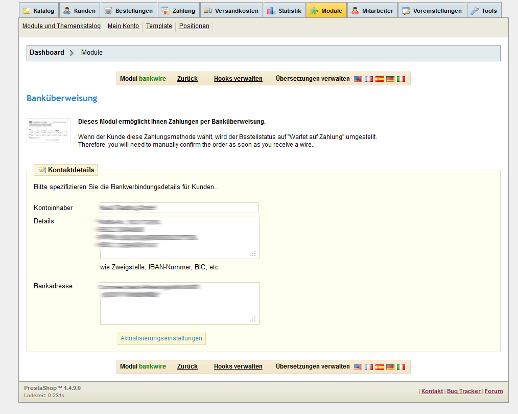 guest* Posted September 19, 2012 Share Posted September 19, 2012 Du verwendest Presta 1.4.9 ? Dann ist das aber nicht das Bankwire-Module welches mit deiner Version mitgekommen ist. Tut mir Leid aber ich habe keine 1.4.9 mehr am Server, weil ich diese soeben upgegradet habe, aber meine 1.4.8.2. zeigt die Bankwire Modulversion 0.5. Warum ist denn deine Version 0.1. ? Deaktivieren und die Original aus dem 1.4.9. Downloadpaket am FTP laden und installieren. Die Version müsste 0.5 oder 0.6 heissen, falls Sie angepasst wurde in PS 1.4.9, aber sicher nicht Version 0.1. Link to comment Share on other sites More sharing options...