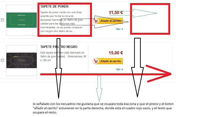 nadie Posted September 20, 2012 Share Posted September 20, 2012 Buenas noches, hace unos dias el buen amigo Nadie me soluciono una cosita que yo no sabia hacer y fue eliminar el right column, una vez hecho esto los productos de las distintas categorias me salen acortados, es una cuestion de estetica mas que nada, y me gustaria que la descripcion del producto y el precio como el boton de añadir al carrito me ocuparan todo el ancho de la plantilla. No se si me he explicado bien, de todas formas os dejo una imagen donde os pongo lo que quiero rellenar. Imagino que hay que tocar en el product_list pero mis conocimientos son tan nulos que ya he tenido que volver a subir el fichero de como lo tengo ahora varias veces por que de lo que tocaba nada era. Muchas gracias de antemano por la ayuda que me podais prestar. Tienes que buscar esto: #product_list li .center_block { float: left; padding: 0 7px; width: 342px; border-right: 1px dotted #CCC; } Y dejarlo asi: #product_list li .center_block { float: left; padding: 0 7px; width: 495px; border-right: 1px dotted #CCC; } Link to comment Share on other sites More sharing options...