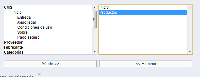 tonipolo Posted September 23, 2012 Author Share Posted September 23, 2012 modulos-aplicaciones del front office-menú horizontal superior (configure)/ ahí en el cuadro de la derecha pones ej. inicio y abajo escribes productos. en este caso donde productos sale tanto en inicio como en la barra horizontal. espero te sirva. saludos!!! Muchas gracias por fin veo donde estaba mi problema,. pense que seria algo de categorias pero es de como bien dice de menú horizontal superior de dentro de modulos..!! Gracias Link to comment Share on other sites More sharing options...