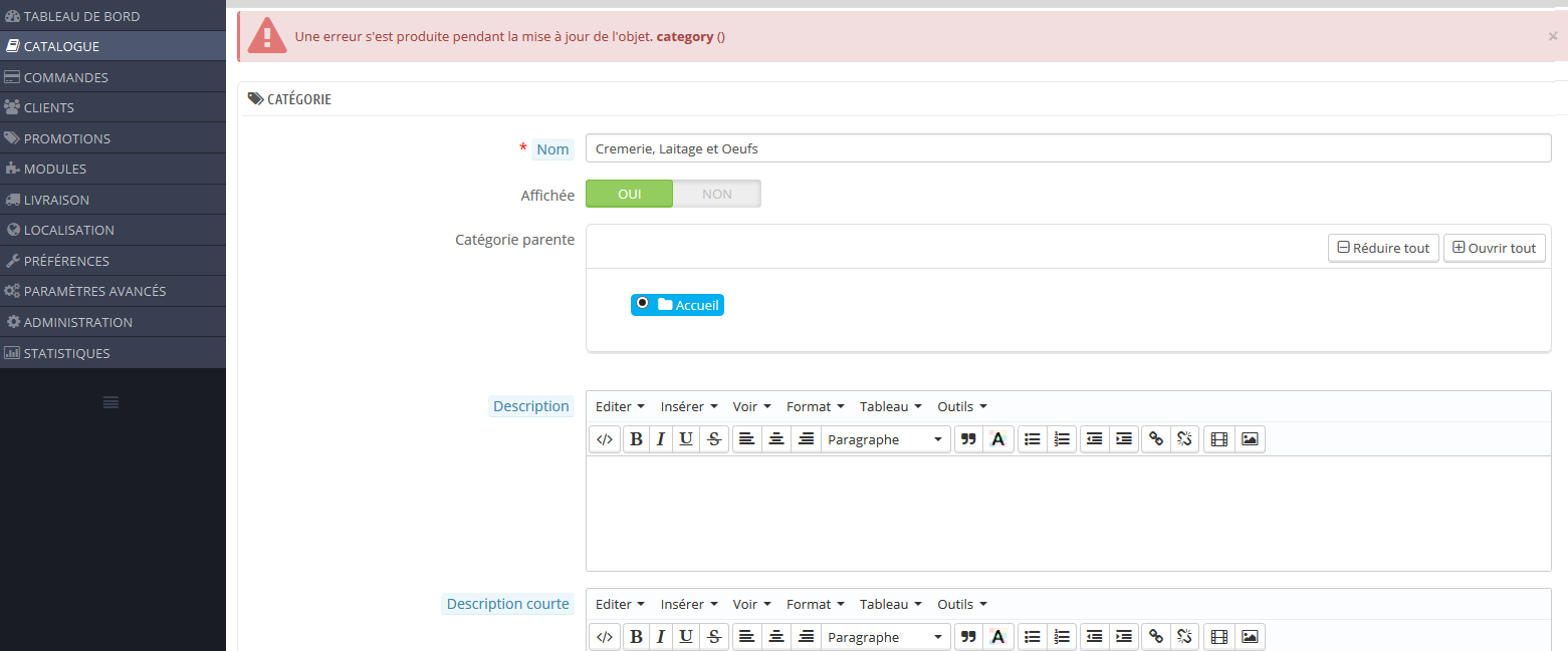 Fulanyboy Posted February 12, 2015 Share Posted February 12, 2015 (edited) @webdigit Merci pour ta réponse . J'ai suivi le tuto en essayant de l'adapter comme je voulais une description des produits affichés sur les pages catégories. J'ai bien mon champ qui apparait en BO mais dès que je veux enregistrer une description j'ai un message d'erreur "Une erreur s'est produite pendant la mise à jour de l'objet. category ()". J'ai vidé le cache après mes modifications pourtant. Je me demandais si l'appel du nouveau champ ne devrait pas se faire dans product-list.tpl , mais pareil ça marche pas. Edited February 12, 2015 by Fulanyboy (see edit history) Link to comment Share on other sites More sharing options...
