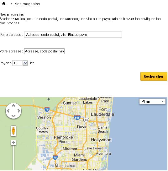 diegoooaaal Posted September 25, 2012 Author Share Posted September 25, 2012 Salut, Je n'ai surement pas été clair... Alors je cherche à faire en sorte que la page "Nos magasins" devienne telle que représentée sur le screenshot en pièce jointe. Je n'ai plus un champ d'adresse mais deux, et je souhaite que le bouton "Rechercher" me cherche tous les magasins proches des deux adresses entrées. Si il manque des précisions, n'hésitez pas à me le dire ! 1 Link to comment Share on other sites More sharing options...