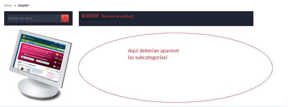 al clickear en la categoría Alquiler, deberían aparecer las tres subcategorías Casas, Apartamentos etc pero no aparecen. solo dice que no hay productos.