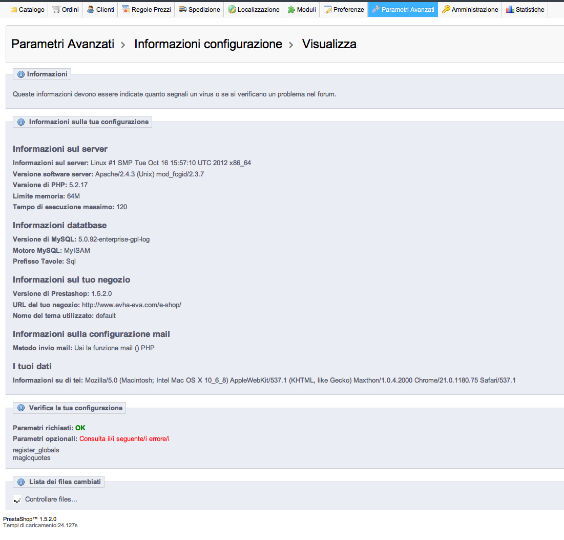 devil7777 Posted September 26, 2012 Share Posted September 26, 2012 (edited) Salve gente mi sono cimentato ad aggiornare alla versione 1.5.0.17 ho qualche problema con le animazioni delle categorie (si aprono tutti i livelli) e quando si clicca su aggiungi al carrello l'immagine non si anima ma ti porta direttamente nel carrello. pls mi date una mano?? Informazioni sulla tua configurazione Informazioni sul server Informazioni sul server: Linux #1 SMP Fri Aug 24 01:07:11 UTC 2012 x86_64 Versione software server: Apache/2.4.3 (Unix) mod_fcgid/2.3.7 Versione di PHP: 5.3.16 Limite memoria: 128M Tempo di esecuzione massimo: 120 Informazioni datatbase Versione di MySQL: 5.5.24-55-log Motore MySQL: InnoDB Prefisso Tavole: ps_ Informazioni sul tuo negozio Versione di Prestashop: 1.5.0.17 URL del tuo negozio: http://www.abitilavoro24.it/ Nome del tema utilizzato: bianco Informazioni sulla configurazione mail Metodo invio mail: Usi la funzione mail () PHP I tuoi dati Informazioni su di tei: Mozilla/5.0 (Windows NT 5.1) AppleWebKit/535.19 (KHTML, like Gecko) Chrome/18.0.1025.142 Safari/535.19 Verifica la tua configurazione Parametri richiesti: OK Parametri opzionali: OK Edited September 27, 2012 by devil7777 (see edit history) Link to comment Share on other sites More sharing options...