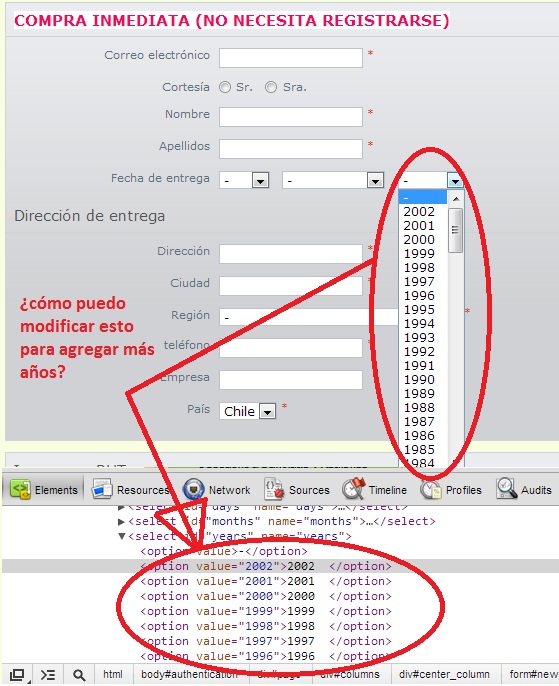 blackdroots Posted September 29, 2012 Share Posted September 29, 2012 Amig@s, he buscado por todos los archivos de instalación y no doy con la solución. El campo "fecha de cumpleaños" que tiene los campos "dia", "mes" y "año" quiero usarlo como fecha de entrega. Pero resulta que el campo "año" llega sólo hasta el año 2002. Mi idea es agregarle más años para que aparezcan los años actuales y los que vienen. Dónde puedo modificar esta parte?? para agregar los años que necesito que aparezcan?? Es en la parte de "authentication" en la parte de "compra inmediata" Estoy usando la versión 1.4.8 de prestashop Les adjunto un print de pantalla donde explica claramente lo que quiero hacer. Les agradeceré mucho! El sitio que estoy haciendo lo pueden ver en www.deepdesign.cl/tienda1483 Link to comment Share on other sites More sharing options...