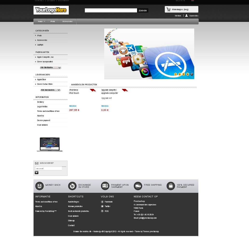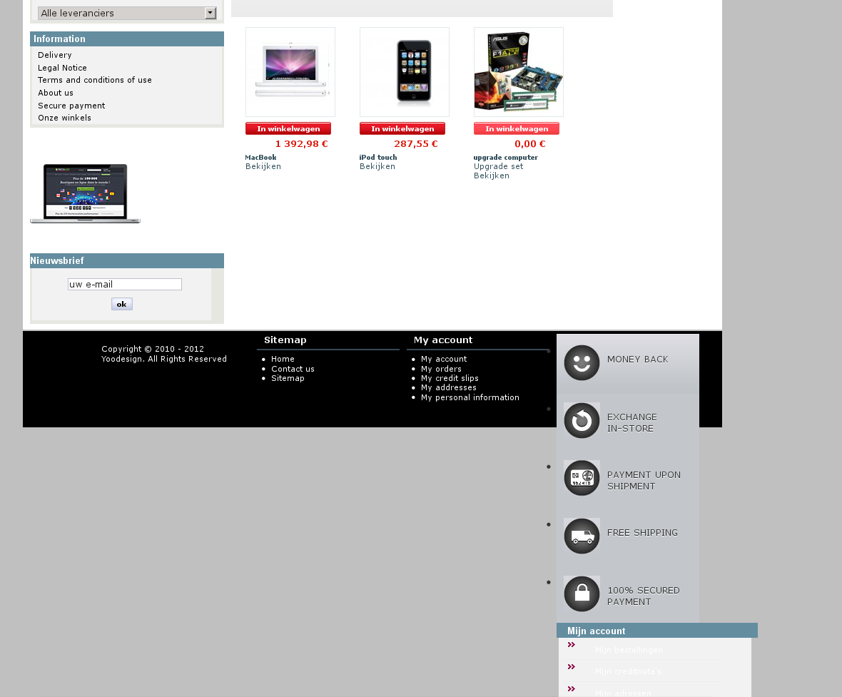 scorpionsworld Posted October 1, 2012 Share Posted October 1, 2012 Oke bedankt nog 1 vraagje gebruik nu een simpel 2 koloms 1.4 template maar de footer ziet er niet goed uit ? is dat simpel op te lossen of kan ik beter zoeken naar een 2 koloms prestashop 1.5 theme. Je moet voor de footer allereerst even kijken naar de volgorde van de modules in de footer hook. Modules->Positions: FooterDe module Block reinsurance zou als eerste moeten staan. Anders verneukt deze de layout. En zo te zien is er naast de My account footer nog een My account module geactiveerd voor de footer die eerder in de linker/rechter kolom zou moeten staan. Link to comment Share on other sites More sharing options...