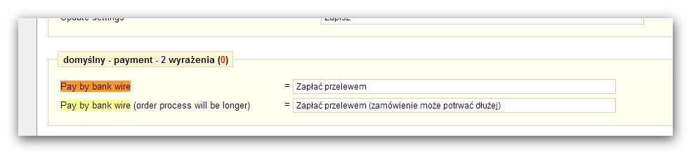 szyms Posted September 30, 2012 Share Posted September 30, 2012 Hi, I have problem with translating my site. There are few texts which i can't translate. For example "Pay by bank wire (order process will be longer)" (first attached picture) still is in English while i have it translated in my back office (second attached picture). Anybody knows how to fix it ? Some texts works fine, another don't and this is strange becouse i can't find any reason for it. Thanks for any help in advance ! Link to comment Share on other sites More sharing options...
