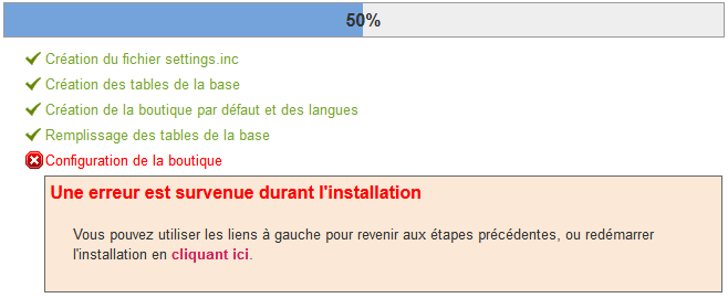 2web.be and luso Posted October 11, 2012 Share Posted October 11, 2012 Moi de même ! 34% Création du fichier settings.inc Création des tables de la base Création de la boutique par défaut et des langues Remplissage des tables de la base Une erreur est survenue durant l'installation Link to comment Share on other sites More sharing options...