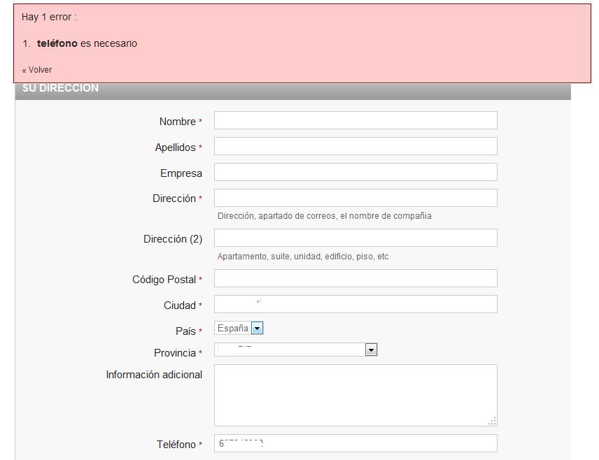 capitaldelpoker Posted October 1, 2012 Share Posted October 1, 2012 (edited) Buenas noches, despues de varios dias sin tener movimiento en la tienda, esta tarde me ha llamado un cliente indicandome que llebaba un rato intentando registrarse en ella y que no le dejaba la tienda por que tenia que poner el telefono, logicamente el telefono lo ponia, despues de esa llamada me he puesto a mirarlo pero no doy con el tema, por eso recurro a vosotros para ver si me podeis ayudar. Os pongo una imagen para que veais el error que me sale. La version de prestashop que estoy usando es la 1.4.8.2 y el theme el prestashop_new. Si queries intentar registraros en https://www.capitaldelpoker.es. Un saludo y desde ya muchas gracias por la ayuda que prestais EDITADO: Lo he solucionado desmarcando desde el backend en la pestaña clientes>direcciones>Definir campos obligatorios para este sección las casillas tanto de phone como phone_mobile y volviendo a dejar el authentication.tpl de esta forma: <p class="required text"> <label for="phone">{l s='Phone'} <sup>*</sup></label> <input type="text" class="text" name="phone" id="phone" value="{if isset($smarty.post.phone)}{$smarty.post.phone}{/if}"> </p> Imagino que sera una chapuza pero me saca del paso. Edited October 2, 2012 by capitaldelpoker (see edit history) Link to comment Share on other sites More sharing options...